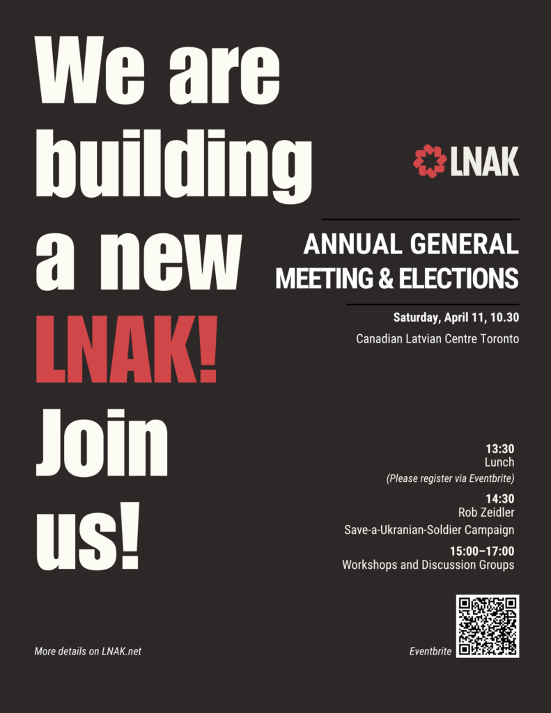 On Saturday, April 11, the LNAK community will meet at the Latvian Centre in Toronto for its annual general meeting under the new bylaws that were passed in 2025. There will be several major changes. First, Latvian organizations are eligible … ...